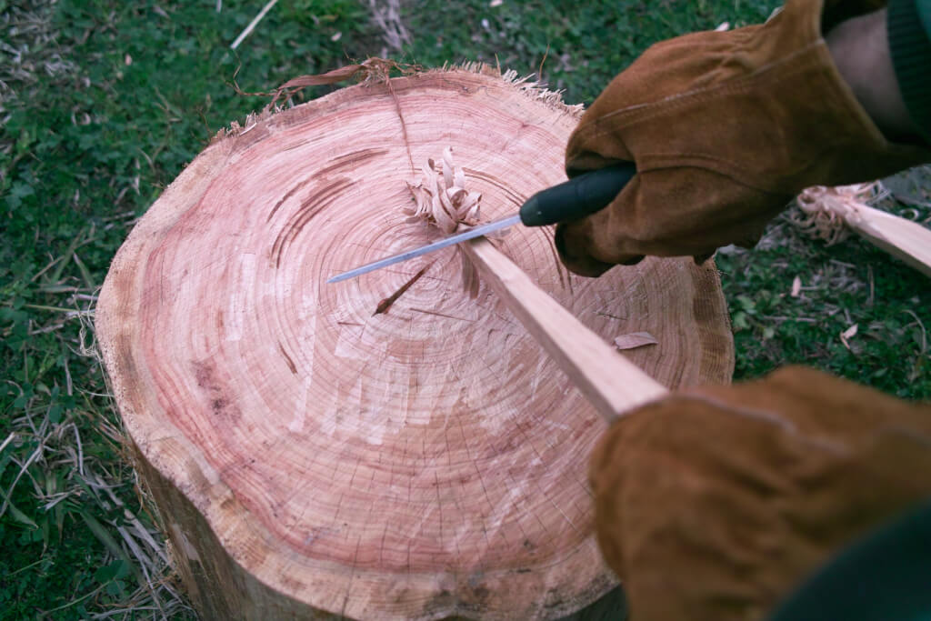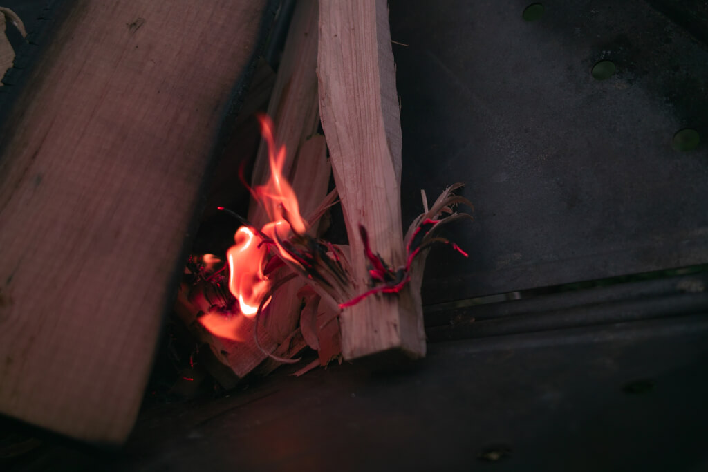 ナイフを使った薪割り ↓ フェザースティックを作る ↓ 種火の元を作る ↓ ファイヤースターターで着火 ↓ 焚き火の完成! |